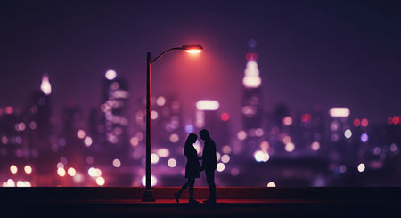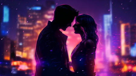 couple stands face face silhouetted beautifully glow vibrant bokeh lights embodying intimate moment magical evening.