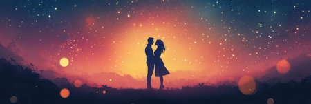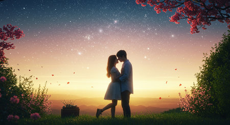 Two lovers share a tender moment beneath a stunning starry sky filled with a warm glow, creating a dreamy and romantic setting.