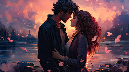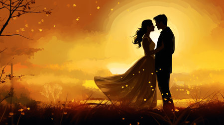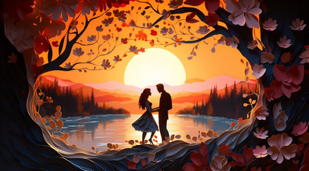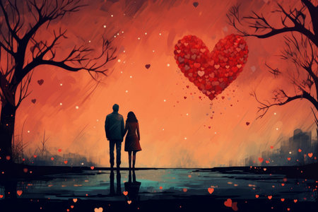 Artistic concept art depicting a silhouette of a couple embracing against a heart-shaped glowing background. The warm light and emotional ambiance create a romantic scene.