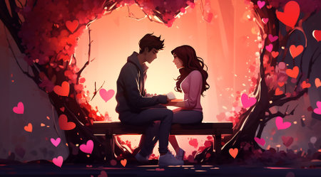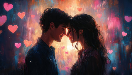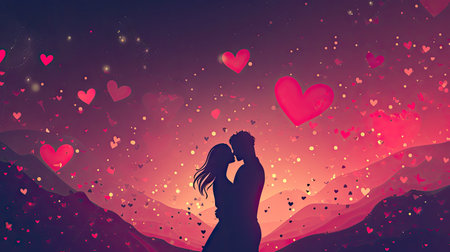 A couple stands closely together, sharing an intimate moment. Heart shapes float around them in a warm, glowing atmosphere at twilight, creating a romantic ambiance.