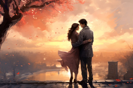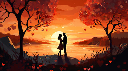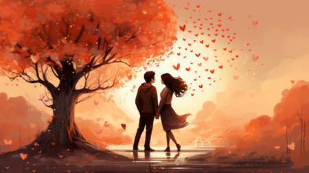 Couple lovers in park, under tree, in sunset. Valentine's day illustration