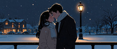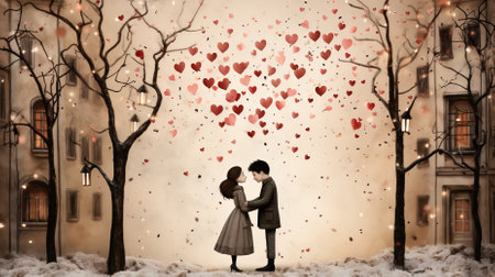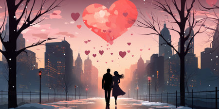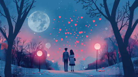 A couple strolls through a quiet, snowy park on Valentine's Day, surrounded by softly glowing street lamps and a sky filled with hearts, creating a romantic atmosphere.