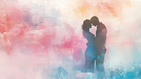 Romantic watercolor artwork depicting lovers blending into a soft pastel background. The gentle brushwork and dreamy aesthetic create a serene and intimate atmosphere.