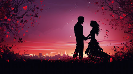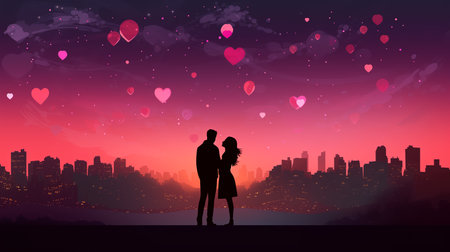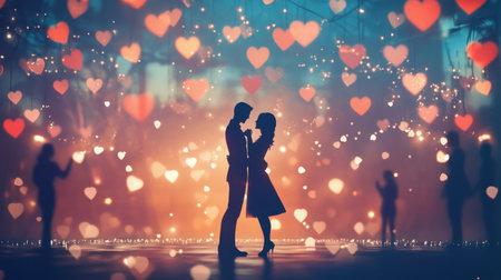 valentines, A loving couple is silhouetted against a vibrant backdrop of heart-shaped bokeh lights, creating an atmosphere of romance and celebration.