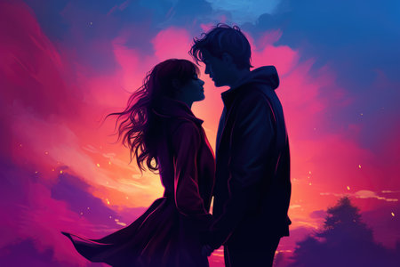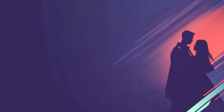 A couple stands closely together their silhouettes outlined by a colorful abstract background. The warm hues create an intimate atmosphere as dusk settles in.