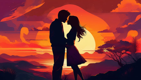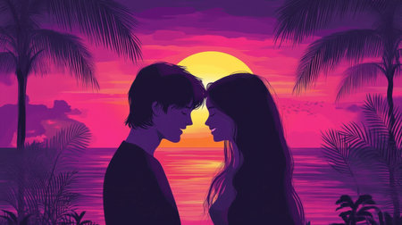 A beautifully illustrated silhouette of a couple at sunset, surrounded by palm trees and a vibrant ocean view, evoking feelings of romance and serenity.