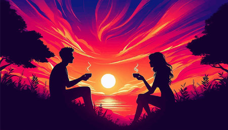 Silhouette of a couple drinking coffee at sunset. Vector illustration