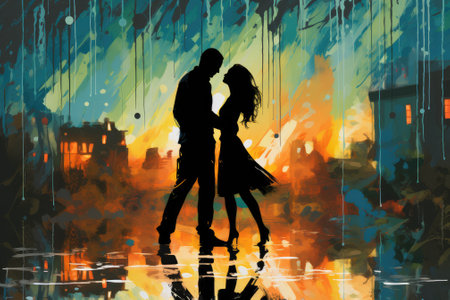 Silhouette of a couple embracing in the rain, with vibrant abstract background.