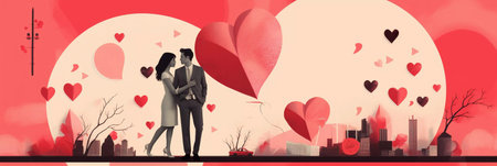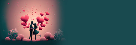 Cute couple in love hugging with many hearts floating Banner, Valentine's Day Card, Copy Space, Template, Romantic, 14 February.