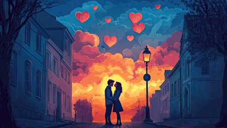 A vibrant vector illustration of two lovers standing under a streetlight, surrounded by heart-shaped clouds in an old European city at sunset. The man and woman gaze into each other's eyes with love as they embrace. A colorful sky is painted behind them, adding to their romantic atmosphere. The scene captures the essence of a Valentine's Day celebration, filled with warmth and tenderness. The focus is on the faces of the couple. --ar 53:30 --v 6.1 Job ID: 05770126-6a25-40db-9b1e-69b22f6dda22