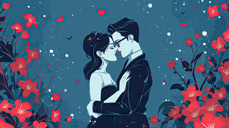 Beautiful couple in love kissing on the background of flowers. Vector illustration.