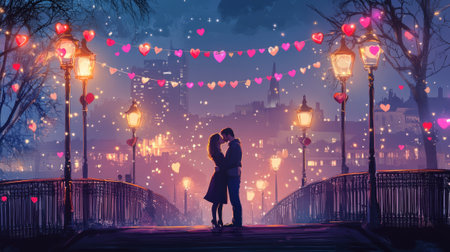 Couple in love kissing on a bridge, street lamps decorated with garlands of hearts, Valentine's Day
