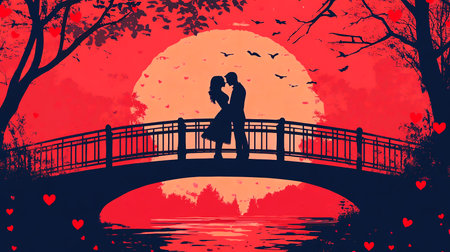 Couple hugging and kissing on a bridge connecting two coasts, concept art, illustration.