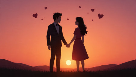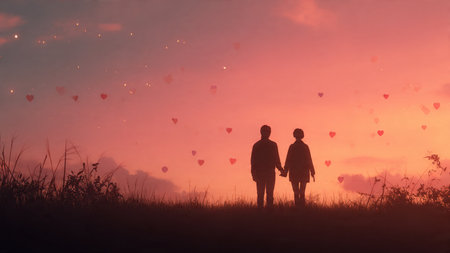 A couple enjoys a romantic sunset walk, their silhouettes highlighted by a vibrant sky and soft heart-shaped lights, exuding warmth.