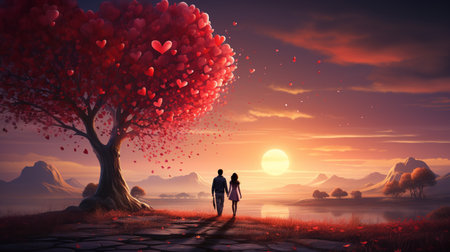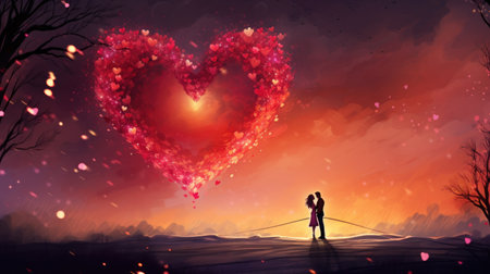 As the sun sets, a couple holds hands, silhouetted against a stunning pink and red sky filled with gentle heart-shaped lights.