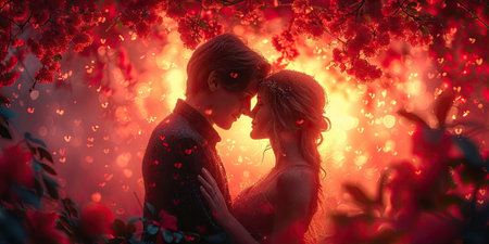 A couple stands closely together, sharing an intimate moment. Heart shapes float around them in a warm, glowing atmosphere at twilight, creating a romantic ambiance.