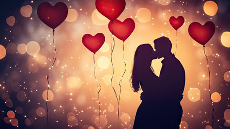 A couple sharing a passionate kiss in front of a romantic backdrop of floating heart-shaped balloons and soft lights.
