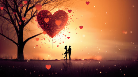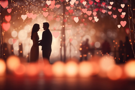 valentines, A loving couple is silhouetted against a vibrant backdrop of heart-shaped bokeh lights, creating an atmosphere of romance and celebration.