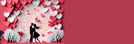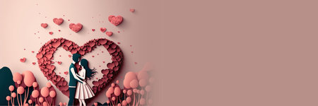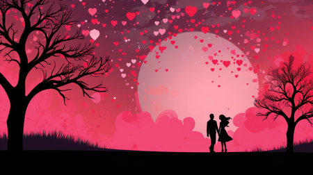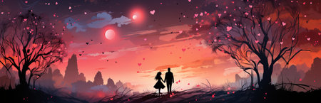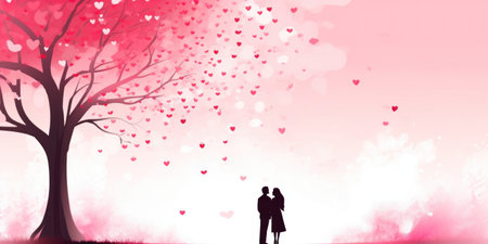 Romantic background illustration, trees decorated with pink hearts. drawing with couple on a date, banner with copy space. Concept: love and valentine's day.