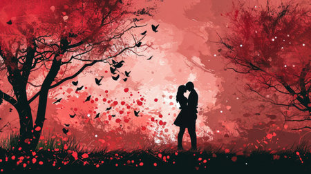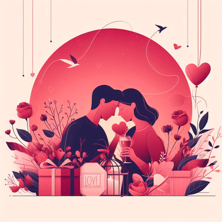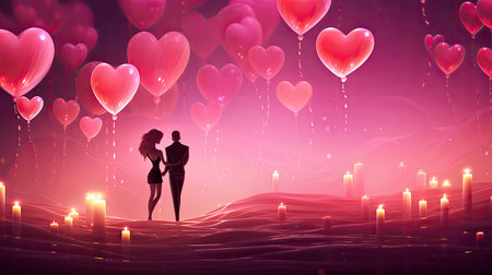 A couple in love, their silhouettes intertwined with heart-shaped balloons, their faces illuminated by the soft glow of romantic lighting, creating an atmosphere filled with warmth and tenderness, in the style of a watercolor illustration with pastel colors, digital art medium, vector graphics. --ar 47:26 --v 6.1 Job ID: bedb280a-8fe4-44e3-860e-419e85aeca36