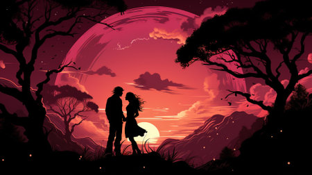 Couple lovers in park, under tree, in sunset. Valentine's day illustration