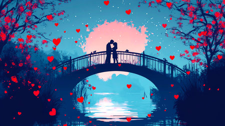 Couple hugging and kissing on a bridge connecting two coasts, concept art, illustration. Love.