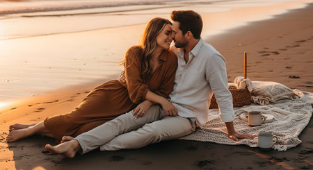 Couple shares a romantic moment on the beach during sunset while enjoying each others company in a serene atmosphere