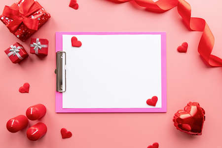 White blank A4 paper on the top of a pink envelope surrounded by valentine themed decorations, and a fluffy pink carpet as the background