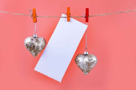 Christmas balls, hearts and a sheet of paper hang on a rope on a blue background. Place for your text. Christmas card.