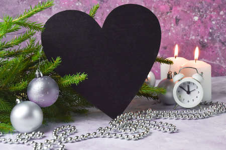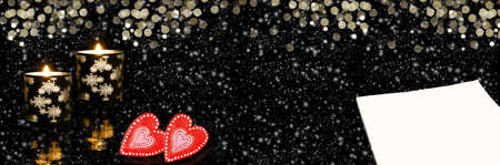 Christmas widescreen background with a blank sheet for your text, holiday candles and hearts on a black background with bokeh. Art design, banner