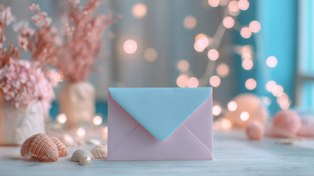 Pastel envelope on a light wooden surface, surrounded by delicate coral, seashells, and dreamy bokeh lights in the background