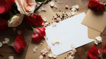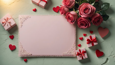 Vibrant red roses encircle an empty space, accompanied by small gift boxes and heart shapes, creating a romantic setting perfect for love letters or special occasions.