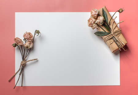 Spring bouquet of dried flowers with Steel letter opener and Empty Blank Paper, on vintage background. Selective focus. copy space.