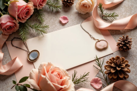 Romantic flat lay with pink roses, lockets, and a blank card. A feminine arrangement with flowers, jewelry, pine cones, and a ribbon.