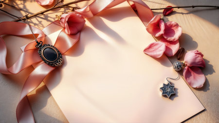 A flat lay shows a blank card surrounded by pink ribbons, flowers, and jewelry.
