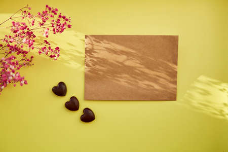 Feminine festive vintage card mock up with shadows, chocolate hearts and gypsophila decorations. Womens Day concept. Mockup postcard. Copy space.