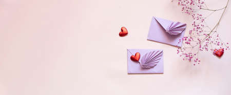 Top view of colorful Valentines Day craft envelope banner format flat lay top view copy space
