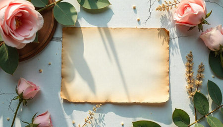 Elegant floral flatlay with vintage paper in warm tones