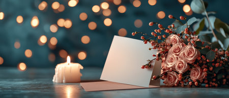 Romantic card and bouquet set against a glowing candlelit backdrop, symbolizing passion and affection