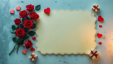 Bright red roses surround a blank card on a pastel blue surface, complemented by heart-shaped decorations and a small gift, setting a romantic tone for celebrating love.