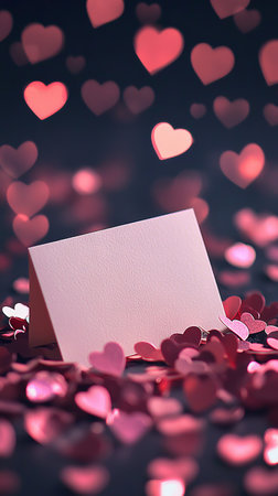 Blank Cream Card Resting Against a Backdrop of Heart Confetti. Concept of Romance, Valentine's Day Celebration, Love, and Festive Decorations. Copy space.