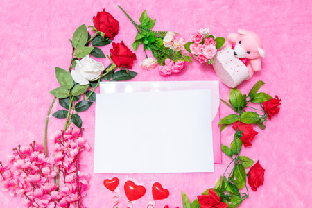 white blank greeting card on the pink background with flowers love letter