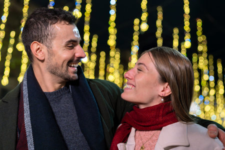 Positive young couple in warm clothes embracing each other on christmas decorated street.