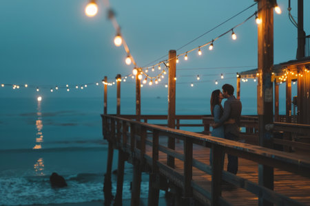 A couple enjoys an intimate moment surrounded by warm lights as night falls.