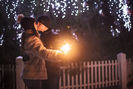 Young romantic couple having fun outdoors in winter before Christmas with sparklers in hands.Enjoying spending time together at winter night.Two lovers are hugging and kissing in Saint Valentine's day