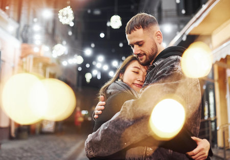 Embracing each other. Happy multiracial couple together outdoors in the city celebrating New year