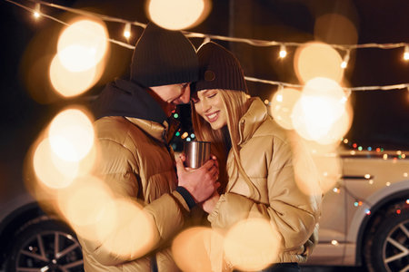 Beautiful garland lighting. Happy young couple celebrating New year outdoors on the street