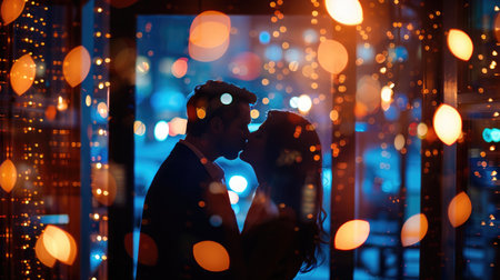 Silhouette kissing couple on panoramic window background with nigth luminous city view. Love in the city concept, copy space