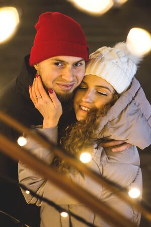 Young couple in love cuddles in the Christmas lights. The girl closed her eyes. The guy is looking at the camera.