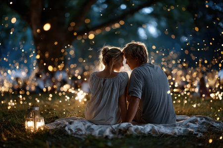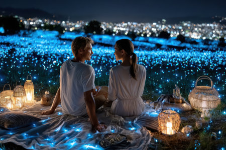 A couple enjoys a cozy picnic on a blanket surrounded by glowing lights in a serene countryside setting.